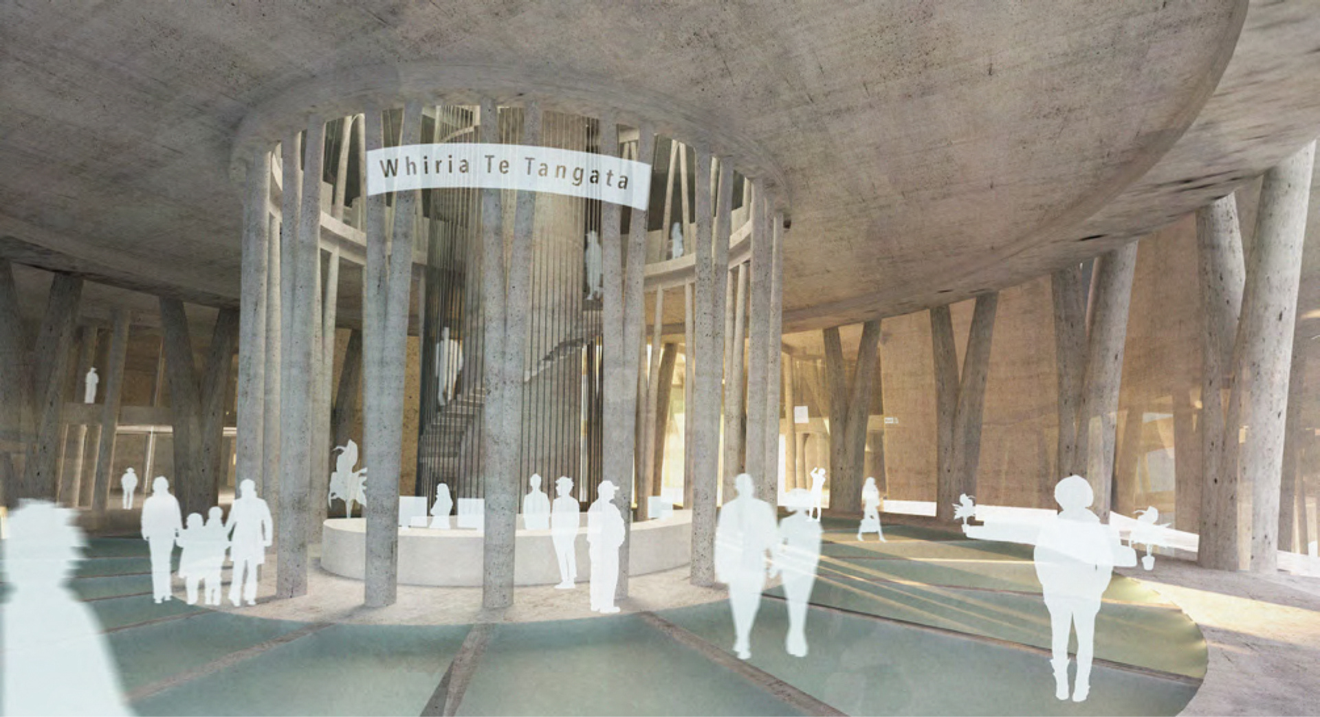 Re-design of the New Zealand National Archives building integrating structure and programme that utilises concrete as the primary building material and design catalyst. Building concept developed from the Whakatauki “Whiria Te Tangata” (weave the people together) and traditional Tukutuku panels, connecting cultures, country and knowledge through design.